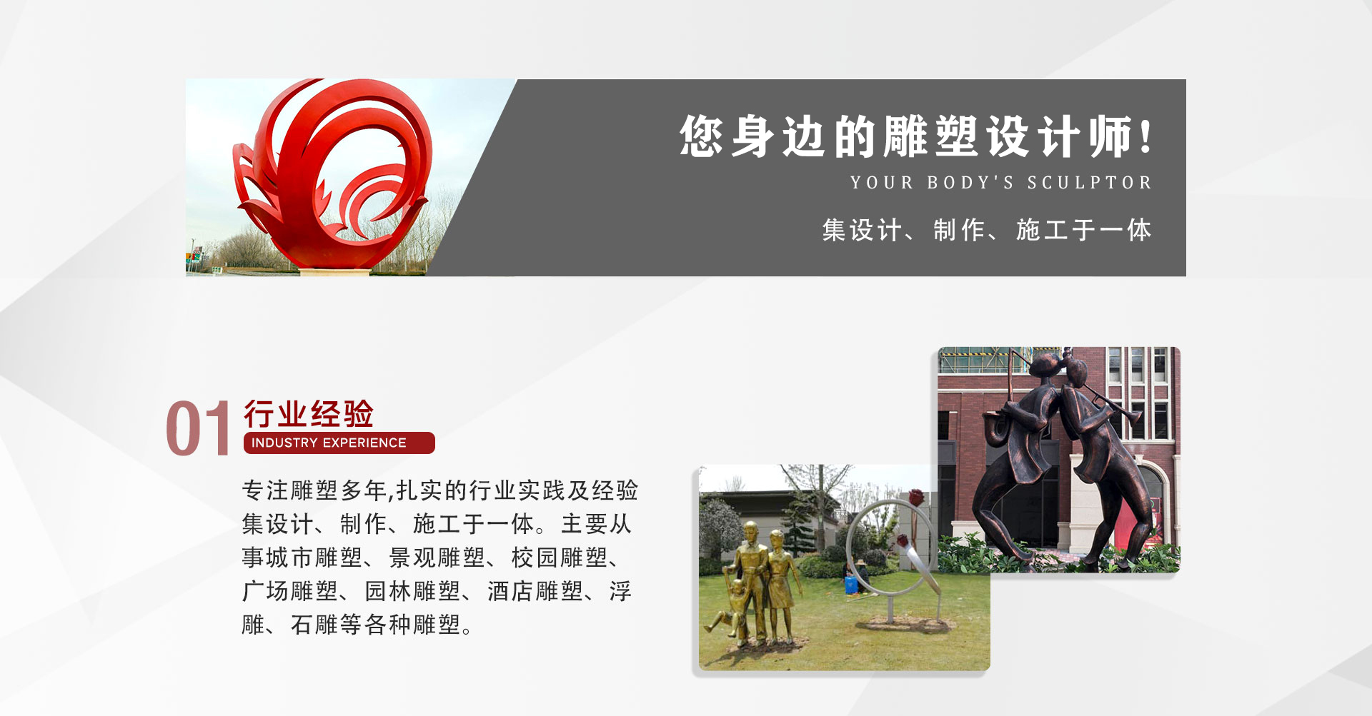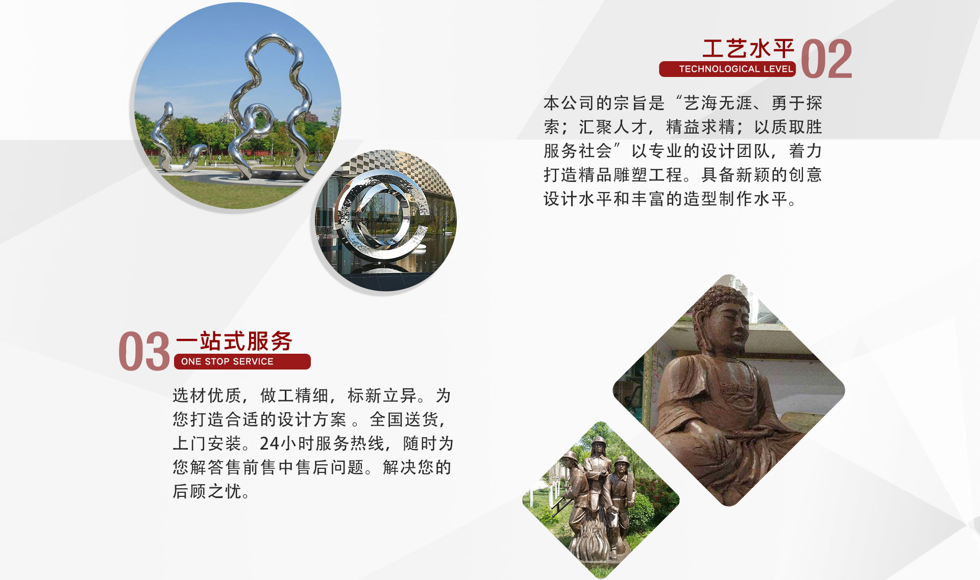 安徽麗豪雕塑藝術(shù)有限公司是集設(shè)計(jì)、制作、施工于一體的專(zhuān)業(yè)雕塑公司。本公司主要從事城市雕塑、景觀(guān)雕塑、校園雕塑、廣場(chǎng)雕塑、園林雕塑、酒店雕塑、浮雕、石雕等各種雕塑。工程材質(zhì)可選用不銹鋼、鑄銅、玻璃鋼、人造砂巖、grc、grg等材料。本公司的宗旨是“藝海無(wú)涯、勇于探索;匯聚人才,精益求精;以質(zhì)取勝、服務(wù)社會(huì)”以專(zhuān)業(yè)的設(shè)計(jì)團(tuán)隊(duì),著力打造精品雕塑工程。主要產(chǎn)品有:鑄銅雕塑、鍛銅雕塑、不銹鋼雕塑、砂巖雕塑、玻璃鋼雕塑、grc系列等系列。我們本著“以客為尊、誠(chéng)信經(jīng)營(yíng)、質(zhì)量為首、薄利多銷(xiāo)”的經(jīng)營(yíng)理念,依托便利的交通,優(yōu)越的環(huán)境,與您攜手共同開(kāi)展友好的交流與合作。